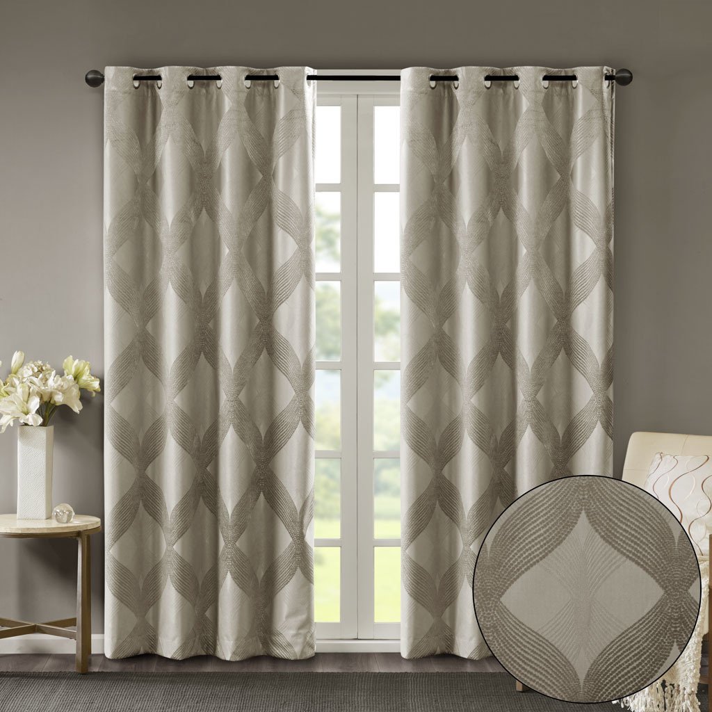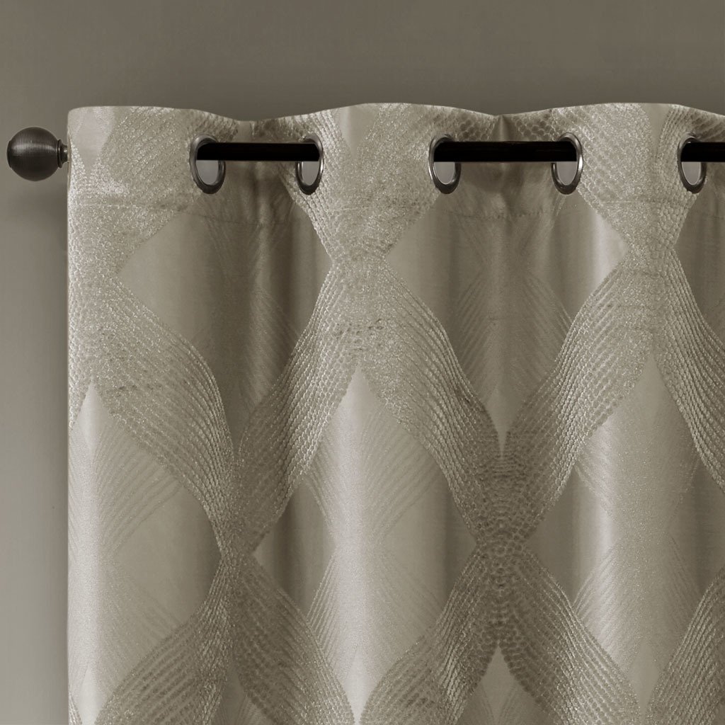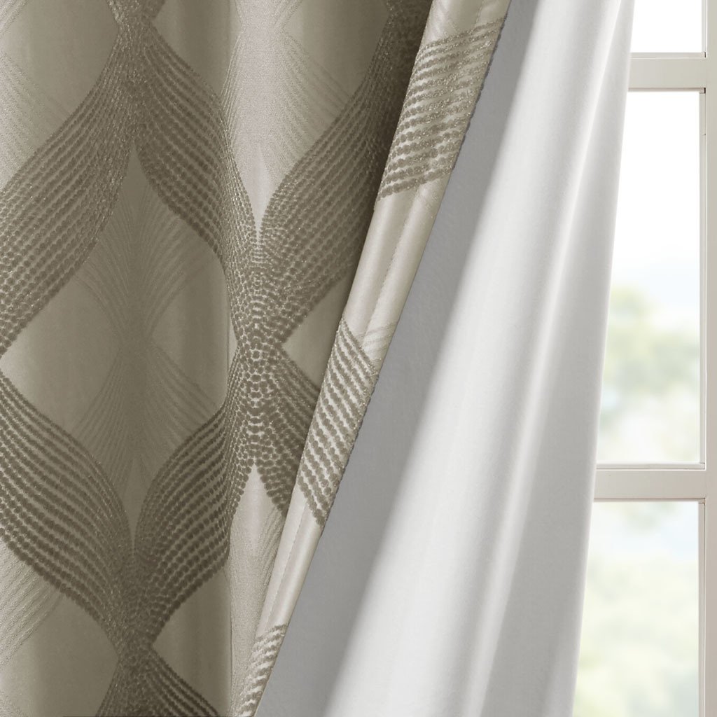Combining luxe style with functionality, our SunSmart Bentley Ogee Knitted Jacquard Total Blackout Panel is the perfect update to dress any window. An ogee knitted jacquard design is featured in a rich taupe hue, creating a luxurious sheen and texture. The heavy fabric uses a foamback and bonding finish enhancing the panel to block out all sunlight, provide a maximum protective barrier against noise intrusion, and offer a maximum level of privacy and energy savings. A silver grommet top finish makes it easy to hang, open, and close panels throughout the day; fits up to a 1.25' diameter rod. With 100% total blackout properties, this window panel is the perfect addition for bedrooms, media rooms, or any private spaces, giving your home a lavish and contemporary appeal. Lighting level: Pitch Black Ambiance.