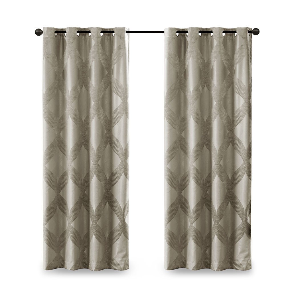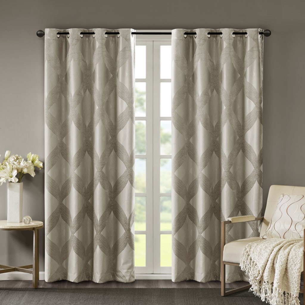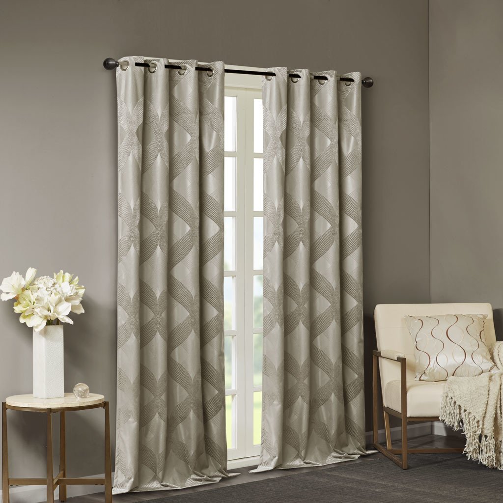 Combining luxe style with functionality, our SunSmart Bentley Ogee Knitted Jacquard Total Blackout Panel is the perfect update to dress any window. An ogee knitted jacquard design is featured in a rich taupe hue, creating a luxurious sheen and texture. The heavy fabric uses a foamback and bonding finish enhancing the panel to block out all sunlight, provide a maximum protective barrier against noise intrusion, and offer a maximum level of privacy and energy savings. A silver grommet top finish makes it easy to hang, open, and close panels throughout the day; fits up to a 1.25' diameter rod. With 100% total blackout properties, this window panel is the perfect addition for bedrooms, media rooms, or any private spaces, giving your home a lavish and contemporary appeal. Lighting level: Pitch Black Ambiance.